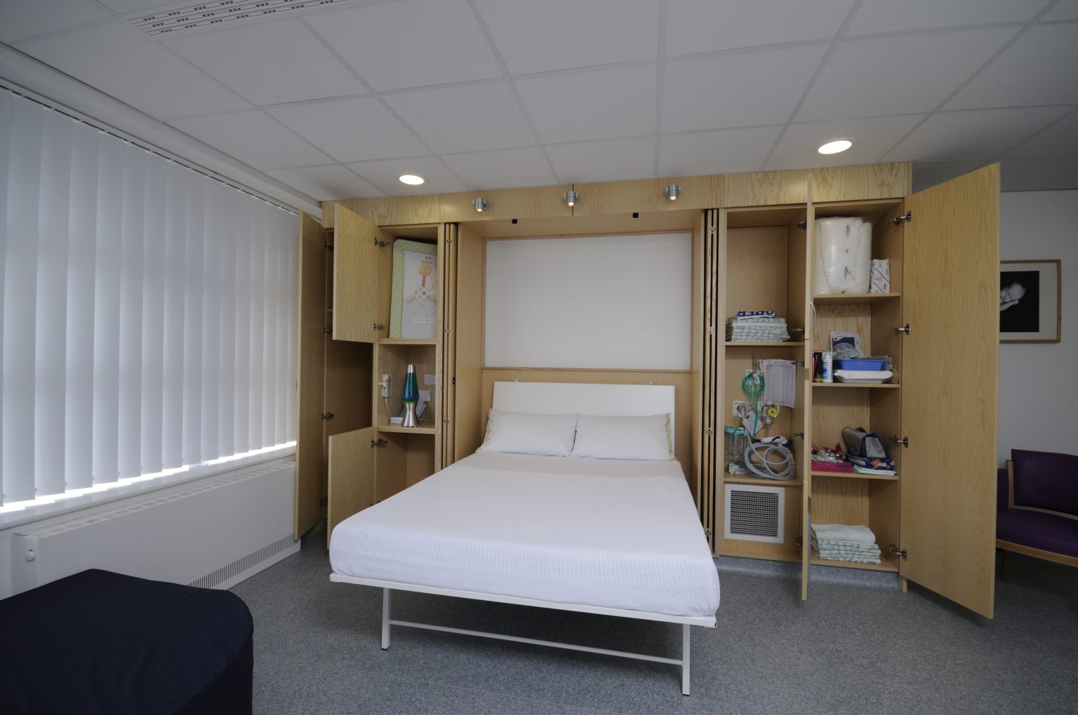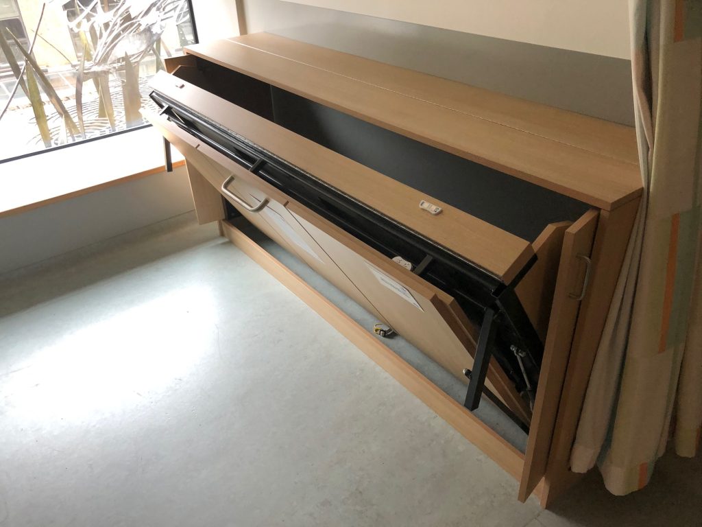 Our wall beds and matching furniture can easily be unfixed, however and re-located -(see Royal Manchester Children’s Hospital Case Study 7), or temporarily moved, to allow for a new floor to be laid, for instance -(see Addenbrookes Hospital Case Study 1).
