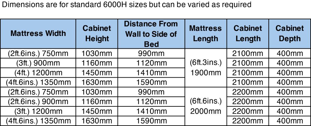 A compact, wall-fixed, sideways-folding wall bed designed to be used in Hospitals and Hospices, where ceiling height, or room layout prevents the use of ‘Vertical’ wall beds. Engineered for daily heavy-duty use with smooth counterbalanced operation, automatic leg action and a lift-up top for added comfort. The 6000H can be pivoted away in seconds, complete with all the bedding. See last image for 6000R Radiator Wallbed option. Wide choice of housing finishes – (matching furniture also available).